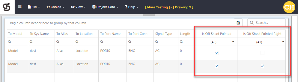 The Offsheet Pointed cables are flagged in the Project Data>Cables grid like this: